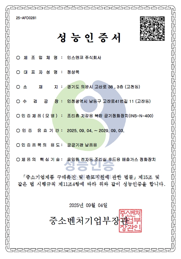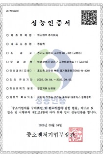 인허가 융복합탈취기 성능인증서