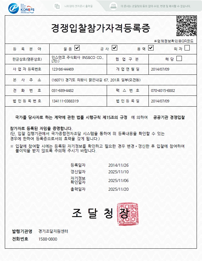 인허가 | 경쟁입찰참가자격등록증 페이지 정보 작성자 인스앤코 작성일16-07-19 14:04 조회3,428회 댓글0건 관련링크 이전글 다음글 목록 본문 인스앤코(주) 등록분야 : 물품, 공사, 용역 댓글목록 등록된 댓글이 없습니다. 이전글 다음글 목록